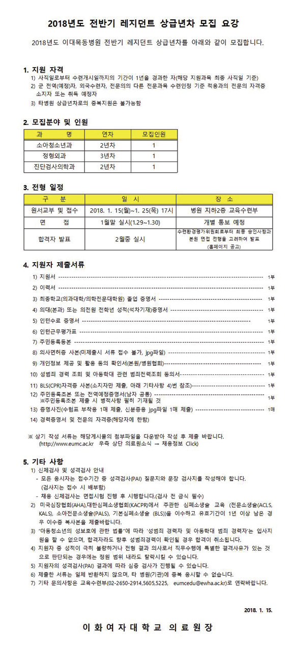 2018년도 전반기 레지던트 상급년차 모집 요강