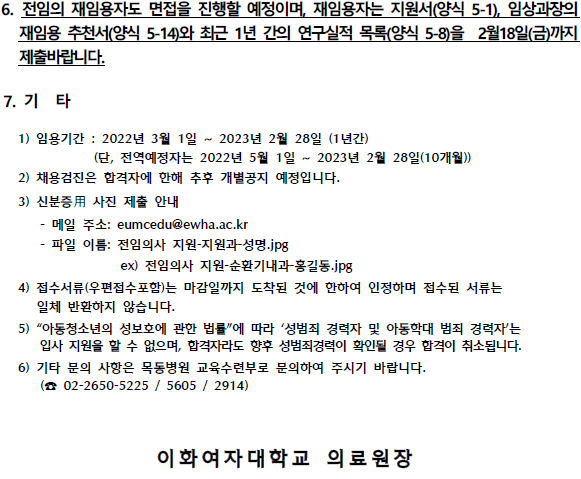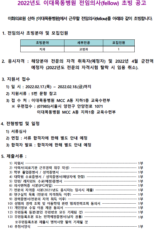 [목동병원] 2022년도 이대목동병원 치과전임의사(fellow) 초빙 공고